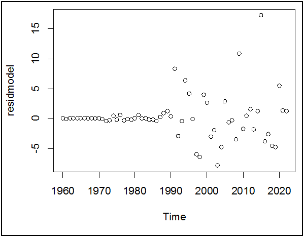 الملاحظ أن هناك مشكلة عدم تجانس التباين Heteroscedasticity، و ذلك لأن البواقي يزيد تشتتها مع الزمن، لكن الاختبار الإحصائي أدق.
