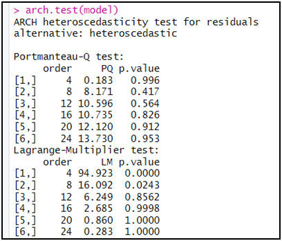 هناك اختبارات عدة لتباين البواقي، و منها ARCH Engle's Test: