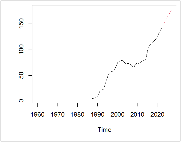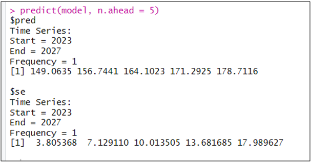نواصل العمل على نموذج ARMA(2,2,0) لنستخدمه للتنبؤ من سنة 2023 إلى 2027: