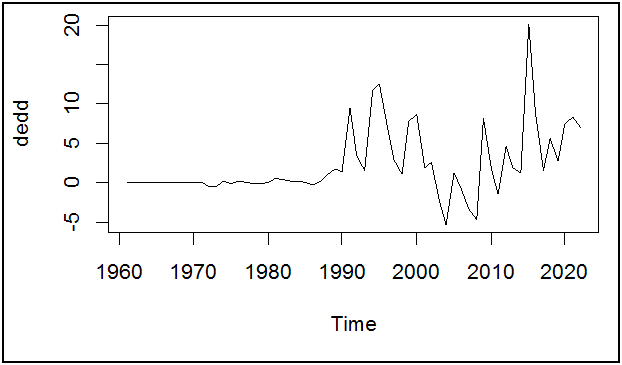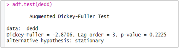 الملاحظ أن اختبار ADF بين أن السلسلة dedd غير مستقرة، و ذلك من خلال عدم رفض الفرضية الصفرية و ذلك كون أن الاحتمال (p-value) أكبر من 5 بالمائة.