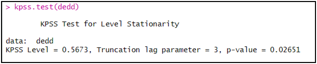 الملاحظ أن اختبار KPSS بين أن السلسلة dedd غير مستقرة، و ذلك من خلال رفض الفرضية الصفرية و ذلك كون أن الاحتمال (p-value) أقل من 5 بالمائة.