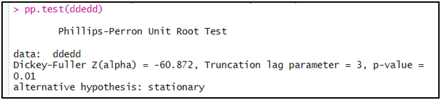 الملاحظ أن اختبار PP بين أن السلسلة ddedd مستقرة، و ذلك من خلال رفض الفرضية الصفرية و ذلك كون أن الاحتمال (p-value) أقل من 5 بالمائة.