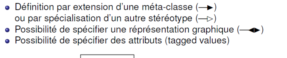 Un stéréotype, noté «nom» permet d’étendre la sémantique d’un diagramme. Un stéréotype peut affecter n’importe quel élément d’un diagramme UML. Pour rappel, UML est un catalogue de 13 diagrammes. Le nom du stéréotype fait référence à un espace de nommage connoté. Par exemple celui de la persistance, du temps réel, de la distribution des composants, etc.