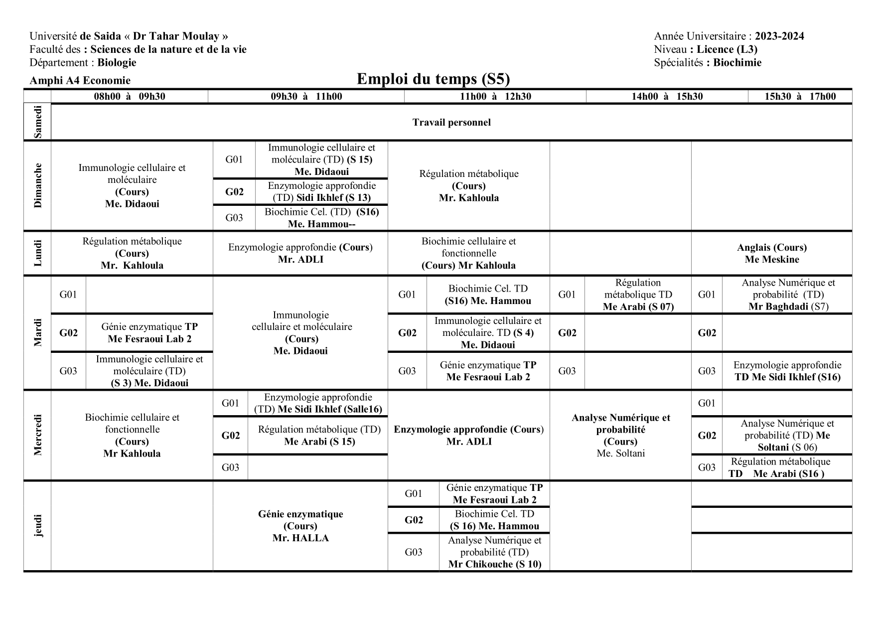 Emploi du temps L3 Biochimie S5